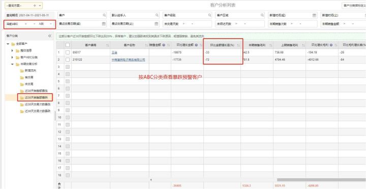 其次,查看客户分类预警表,按不同等级分类查看预警客户的具体情况,然后通过制定拜访计划或是发送优惠券等手段去解决。