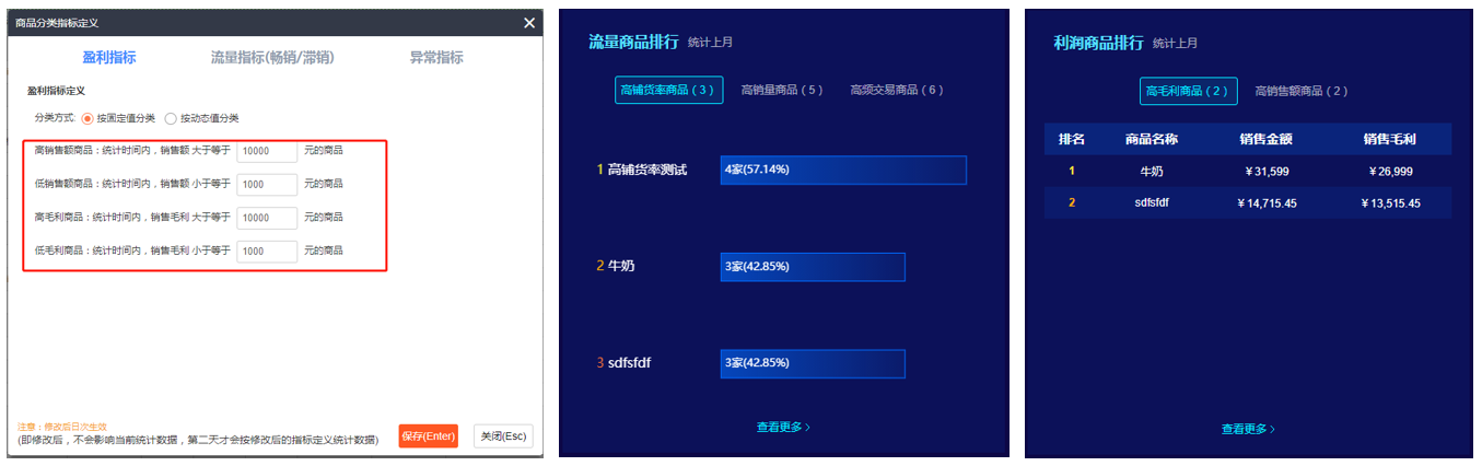 第二,利润、流量商品统计。通过系统首先定义利润、流量商品指标,按标准自动统计滞销商品和畅销商品,然后将这两类商品组合套餐,进行搭配销售,通过商品分析表快速定位滞销商品,分析滞销原型,并及时采取促销等手段出货。