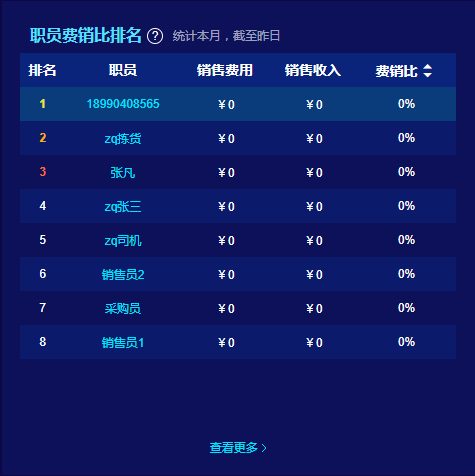 第二,严卡销售费用。通过职员分析—费销比排行来查看每位员工所消耗的费用,找到费用占比高的职员,了解其具体情况,帮助其降低销售费用,为企业制造更多的净利润。