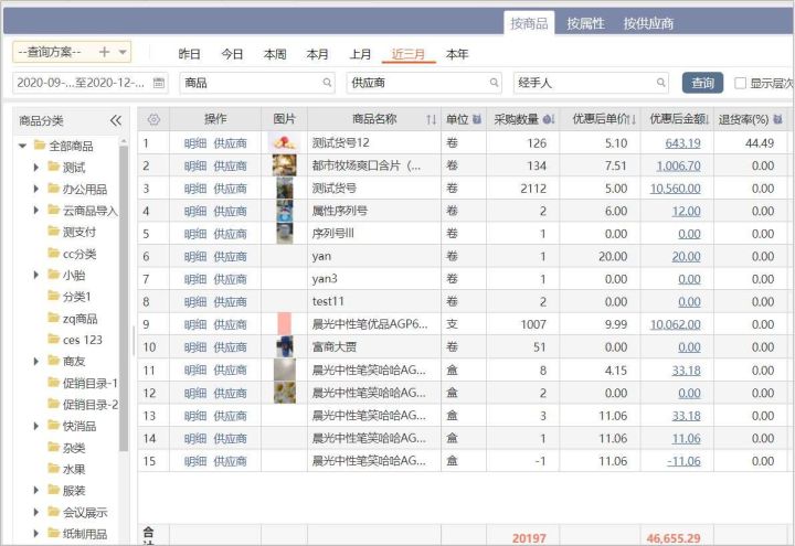 ●采购趋势分析:通过系统采购趋势分析表,能清楚地知道采购了什么,采购了多少,成本多少,还可以看到商品的退货率,这样一来所有采购数据都能清晰掌握。