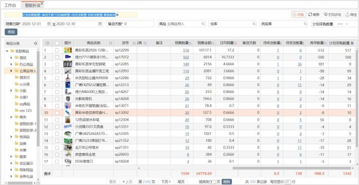 ●智能补货:按照计划采购数量=备货天数*日均销售量+待发货数量-待收货数量-账面库存的公式,分析计算出需要采购的数量