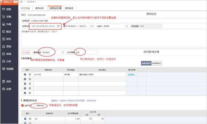费用合同是管理企业为了下游销售产品,而产生的入场费、陈列费等各项费用,与商家签定合同对各项费用进行确认,具有时效性、集中兑付的特点,基于合同这种规范化、标准化形式来管理。