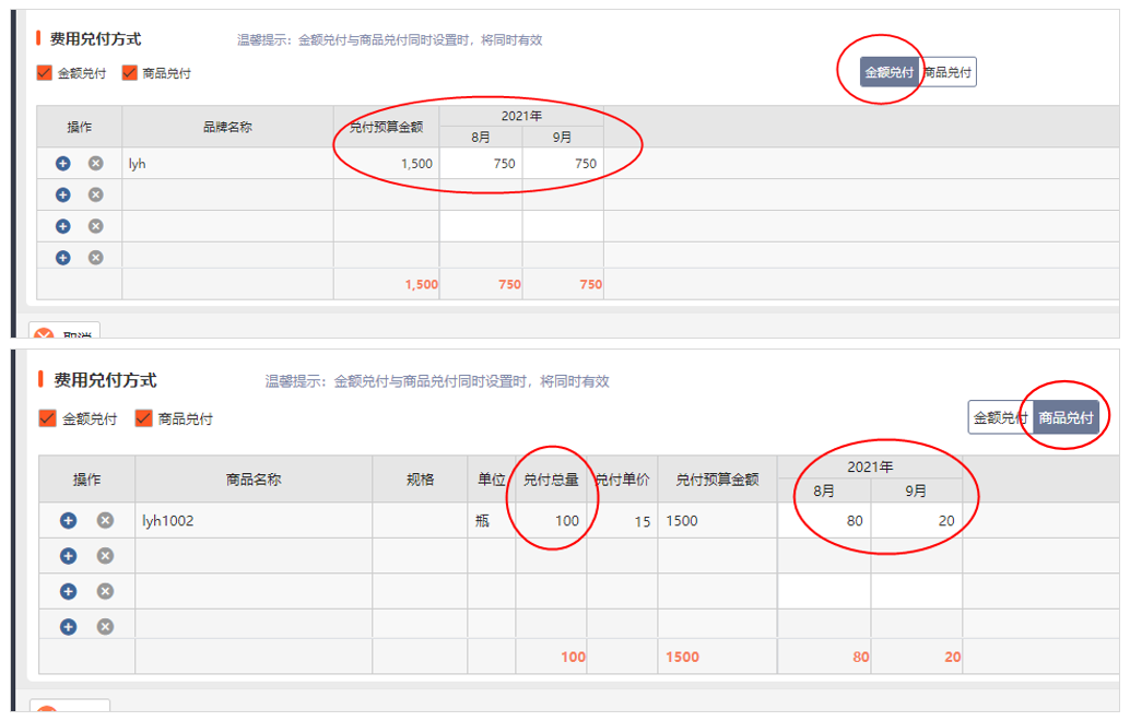 费用兑付方式分为金额兑付和商品兑付,金额兑付是兑付结算时以钱的方式进行兑付,这里确认兑付预算金额和按月兑付时每月分摊金额的确认;商品兑付是兑付结算时以物的方式进行兑付,这里选择要用来进行兑付的商品和数量,按月兑付时每月分摊数量的确认。