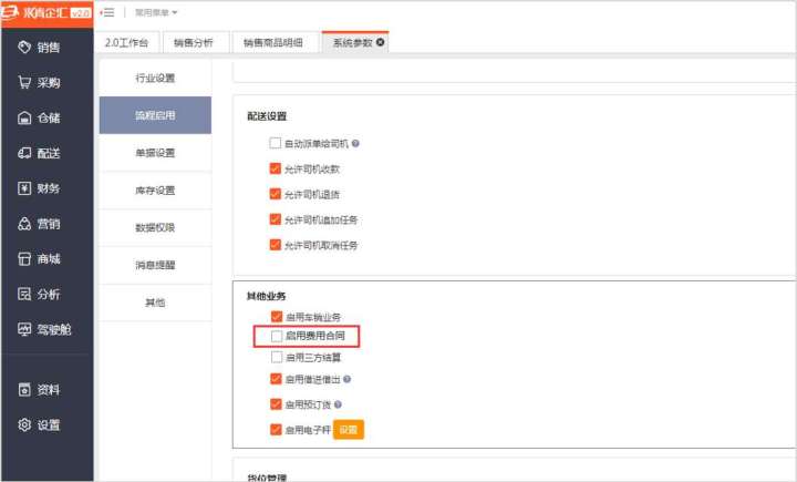系统默认费用合同功能是关闭的,企业如需使用,首先需要在系统参数-流程启用中进行添加设置,如下图: